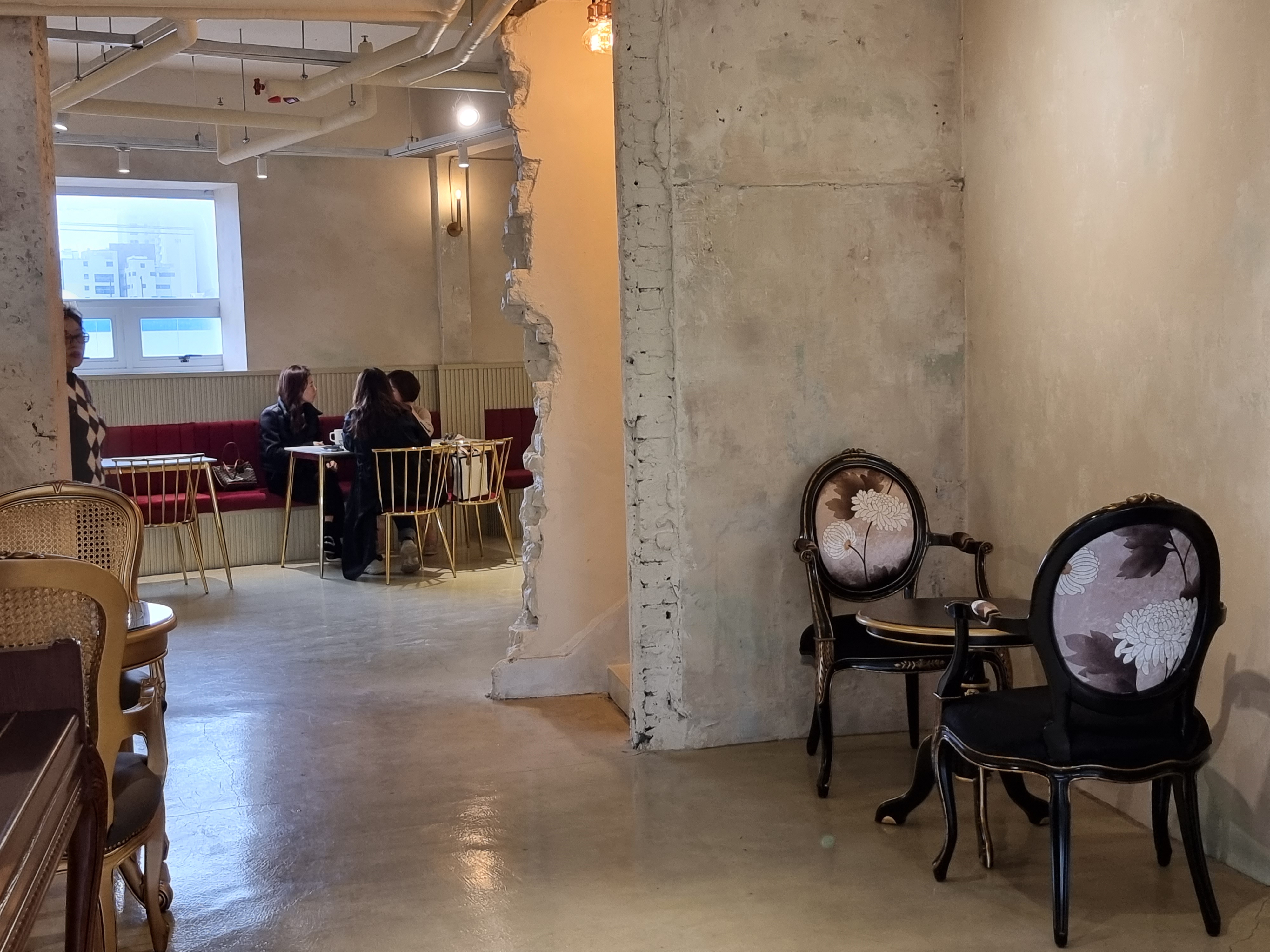 자연스럽게 찢어진 벽이 묘하게 실내 분위기와 잘 어울린다.