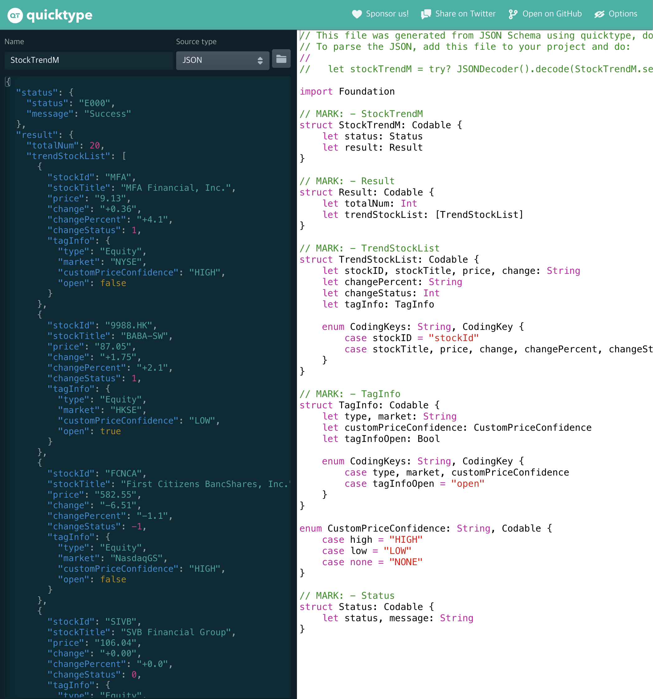 (SwiftUI) 데이터를 model.swift 파일과 일치하는 코드로 변환하는 웹사이트 2023년 03월 27일 by issue – 모든 변환이 완벽하고 깨끗한 것은 아니므로 참고용으로 사용합니다. https://app.quicktype.io/ 모든 언어로 즉시 JSON 구문 분석 | 빠른 사람 app.quicktype.io